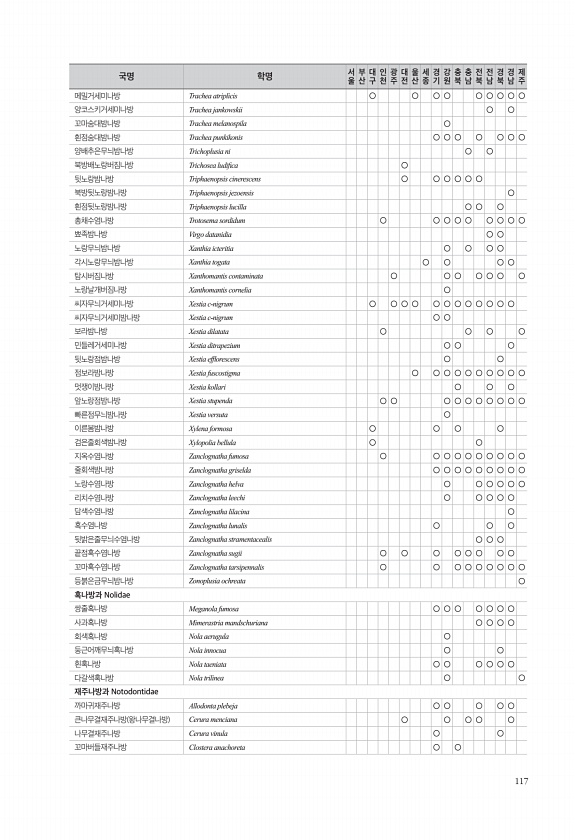 117 메밀거세미나방 Trachea atriplicis ○ ○ ○ ○ ○ ○ ○ ○ ○ 양코스키거세미나방 Trachea jankowskii ○ ○ 꼬마숨대밤나방 Trachea melanospila ○ 흰점숨대밤나방 Trachea punkikonis ○ ○ ○ ○ ○ ○ ○ 양배추은무늬밤나방 Trichoplusia ni ○ ○ 북방배노랑버짐나방 Trichosea ludifca ○ 뒷노랑밤나방 Triphaenopsis cinerescens ○ ○ ○ ○ ○ ○ 북방뒷노랑밤나방 Triphaenopsis jezoensis ○ 흰점뒷노랑밤나방 Triphaenopsis lucilla ○ ○ ○ 총채수염나방 Trotosema sordidum ○ ○ ○ ○ ○ ○ ○ ○ ○ 뾰족밤나방 Virgo datanidia ○ ○ ...