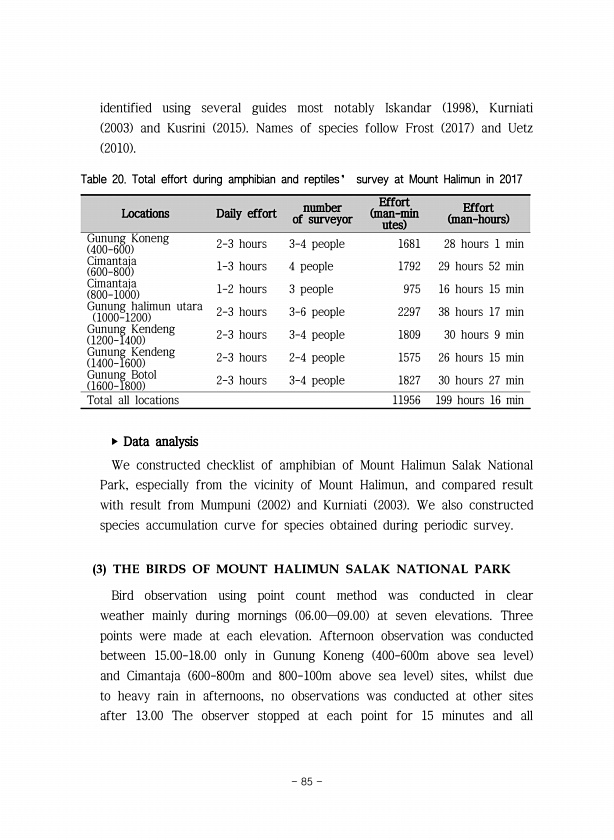 identified using several guides most notably Iskandar 1998 , Kurniati 2003 and Kusrini 2015 Names of species follow Frost 2017 and Uetz 2010 Locations Daily effort number of surveyor Effort man-min utes Effort man-hours Gunung Koneng 400-600 2-3 hours 3-4 people 1681 28 hours 1 min Cimantaja 600-800 1-3 hours 4 people 1792 29 hours 52 min Cimantaja 800-1000 1-2 hours 3 people 975 16 hours 15 min G...