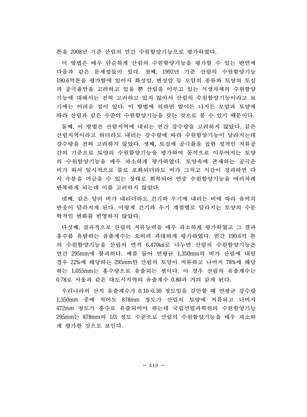 449 톤을 2008년 기준 산림의 연간 수원함양기능으로 평가하였다. 이 방법은 매우 단순하게 산림의 수원함양기능을 평가할 수 있는 반면에 다음과 같은 문제점들이 있다. 첫째, 1992년 기준 산림의 수원함양기능 190.6억톤을 평가함에 있어서 화성암, 변성암 등 모암의 종류와 토양의 토심 과 공극율만을 고려하고 있을 뿐 산림을 이루고 있는 식생자체의 수원함양 기능에 대해서는 전혀 고려하고 있지 않아서 산림의 수원함양기능이라고 보 기에는 어려운 점이 있다. 이 방법에 의하면 밭이든 나지든 모암과 토양에 따라 산림과 같은 수준의 수원함양기능을 갖는 것으로 볼 수 있기 때문이다. 둘째, 이 방법은 산림지역에 내리는 연간 강수량을 고려하지 않았다. 같은 산림지역이라고 하더라도 내리는 강수량에 따라 수원함양기능이 ...