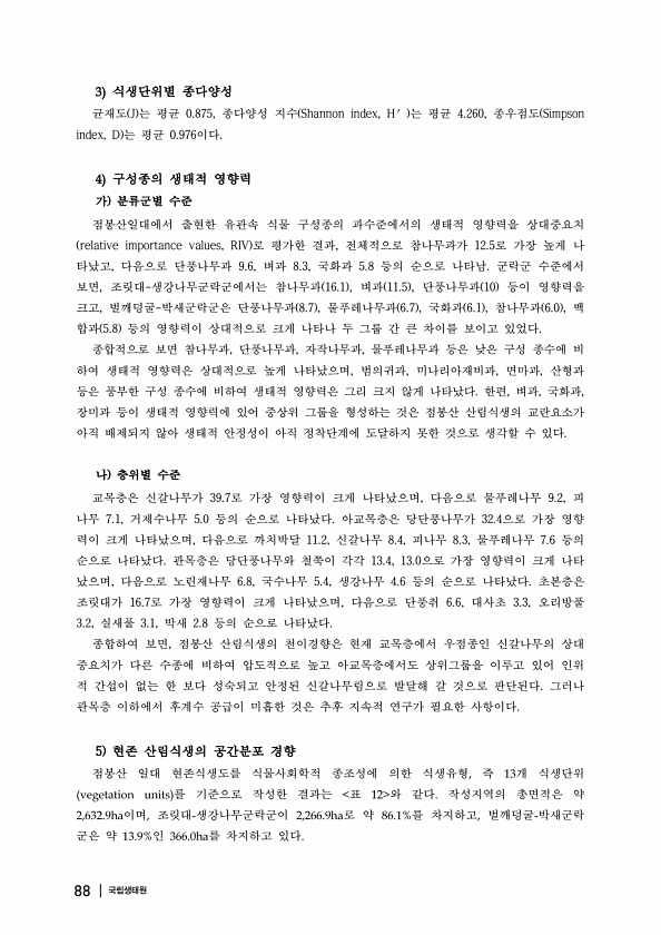 식생단위별 종다양성 균재도 J 는 평균 0.875, 종다양성 지수 Shannon index, H′ 는 평균 4.260, 종우점도 Simpson index, D 는 평균 0.976이다. 구성종의 생태적 영향력 가 분류군별 수준 점봉산일대에서 출현한 유관속 식물 구성종의 과수준에서의 생태적 영향력을 상대중요치 relative importance values, RIV 로 평가한 결과, 전체적으로 참나무과가 12.5로 가장 높게 나 타났고, 다음으로 단풍나무과 9.6, 벼과 8.3, 국화과 5.8 등의 순으로 나타남. 군락군 수준에서 보면, 조릿대-생강나무군락군에서는 참나무과 16.1 , 벼과 11.5 , 단풍나무과 10 등이 영향력을 크고, 벌깨덩굴-박새군락군은 단풍나무과 8.7 , 물푸레나무과 6.7 , 국화과...