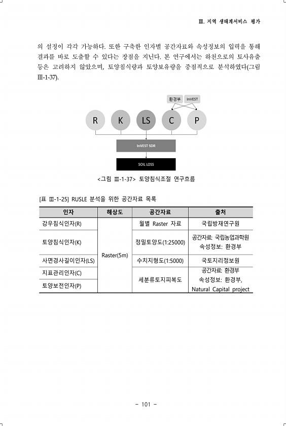 Ⅲ. 지역 생태계서비스 평가 101 의 설정이 각각 가능하다. 또한 구축한 인자별 공간자료와 속성정보의 입력을 통해 결과를 바로 도출할 수 있다는 장점을 지닌다. 본 연구에서는 하천으로의 토사유출 등은 고려하지 않았으며, 토양침식량과 토양보유량을 중점적으로 분석하였다 그림 Ⅲ-1-37 그림 Ⅲ-1-37 토양침식조절 연구흐름 인자 해상도 공간자료 출처 강우침식인자 R Raster 5m 월별 Raster 자료 국립방재연구원 토양침식인자 K 정밀토양도 125000 공간자료국립농업과학원 속성정보환경부 사면경사길이인자 LS 수치지형도 15000 국토지리정보원 지표관리인자 C 세분류토지피복도 공간자료환경부 속성정보환경부, 토양보전인자 P Natural Capital project [표 Ⅲ-1-25] RUSLE 분석을 ...