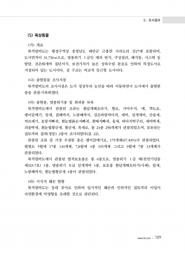 Ⅱ. 조사결과 www.nie.re.kr ? 109 5 육상동물 가 개요 북격렬비도는 행정구역상 충청남도 태안군 근흥면 가의도리 산27에 포함되며, 도서면적이 31,736㎡으로, 멸종위기 Ⅰ급인 매의 번식, 주상절리, 해식동, 시스택 등 발달, 검은따개비 집단서식, 보전가치가 높은 상록수림 분포로 인하여 특정도서로 지정되어 있는 도서이다. 섬 구조는 비교적 둥근형 도서이다. 나 출현동물 조사지점 북격렬비도의 조사시점은 도서 정상부의 능선을 따라 이동하면서 도서에서 출현한 종을 관찰?기록하였다. 다 출현종, 멸종위기종 및 희귀종 목록 북격렬비도에서 관찰된 조류는 흰날개해오라기, 황로, 가마우지, 매, 꺅도요, 괭이갈매기, 칼새, 칡때까치, 노랑때까치, 검은바람까마귀, 제비, 섬개개비, 산솔새, 찌르레기, 호랑지...