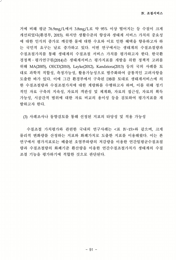 Ⅳ. 조절서비스 91 거에 비해 평균 76.9mg/L에서 3.8mg/L로 약 95% 이상 떨어지는 등 수질이 크게 개선되었다 환경부, 2015 하지만 생활수준의 향상과 생태계 서비스 가치의 중요성 에 대한 인식의 증가로 깨끗한 물에 대한 수요와 이로 인한 혜택을 향유하고자 하 는 국민적 요구는 날로 증가하고 있다. 이번 연구에서는 생태계의 수질조절량과 수질조절가치를 통해 생태계의 수질조절 서비스 가치를 평가하고자 한다. 한국환 경정책?평가연구원 2014 은 생태계서비스 평가지표를 개발을 위한 정책적 고려를 위해 MA 2005 , OECD 2010 , Layke 2012 , Kandziora 2013 등의 국외 사례를 토 대로 과학적 적합성, 측정가능성, 활용가능성으로 범주화하여 공통적인 고려사항을 도출한 바...