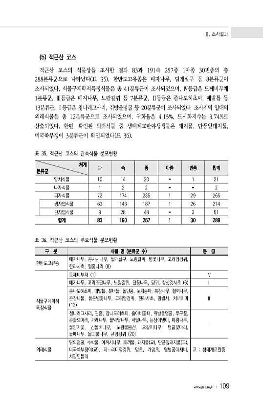 Ⅱ. 조사결과 www.nie.re.kr ? 109 5 적근산 코스 적근산 코스의 식물상을 조사한 결과 83과 191속 257종 1아종 30변종의 총 288분류군으로 나타났다 표 35 한반도고유종은 매자나무, 털개살구 등 8분류군이 조사되었다. 식물구계학적특정식물은 총 41분류군이 조사되었으며, Ⅳ등급은 도깨비부채 1분류군, Ⅲ등급은 매자나무, 노랑갈퀴 등 7분류군, Ⅱ등급은 좀나도히초미, 매발톱 등 13분류군, Ⅰ등급은 청나래고사리, 쥐방울덩굴 등 20분류군이 조사되었다. 조사지역 일대의 외래식물은 총 12분류군으로 조사되었으며, 귀화율은 4.15%, 도시화지수는 3.74%로 산출되었다. 한편, 확인된 외래식물 중 생태계교란야생생물은 돼지풀, 단풍잎돼지풀, 미국쑥부쟁이 3분류군이 확인되었다 표 36 표 35...