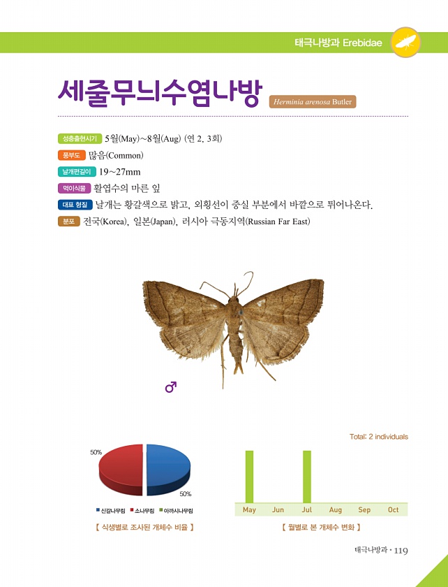 태극나방과?119 태극나방과 Erebidae 성충출현시기 5월 May 8월 Aug 연 2, 3회 풍부도 많음 Common 날개편길이 1927mm 먹이식물 활엽수의 마른 잎 대표 형질 날개는 황갈색으로 밝고, 외횡선이 중실 부분에서 바깥으로 튀어나온다. 분포 전국 Korea , 일본 Japan , 러시아 극동지역 Russian Far East 세줄무늬수염나방 Herminia arenosa Butler 【 식생별로 조사된 개체수 비율 】 50% 신갈나무림 소나무림 아까시나무림 50% 【 월별로 본 개체수 변화 】 Total2 individuals May Jun Jul Aug SepOct