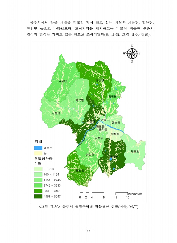 97 공주시에서 작물 재배를 비교적 많이 하고 있는 지역은 계룡면 정안면 탄천면 등으로 나타났으며 도시지역을 제외하고는 비교적 비슷한 수준의 경작지 면적을 가지고 있는 것으로 조사되었다 표 그림 참조 그림 공주시 행정구역별 작물생산 현황 미곡 97 공주시에서 작물 재배를 비교적 많이 하고 있는 지역은 계룡면 정안면 탄천면 등으로 나타났으며 도시지역을 제외하고는 비교적 비슷한 수준의 경작지 면적을 가지고 있는 것으로 조사되었다 표 그림 참조 그림 공주시 행정구역별 작물생산 현황미곡