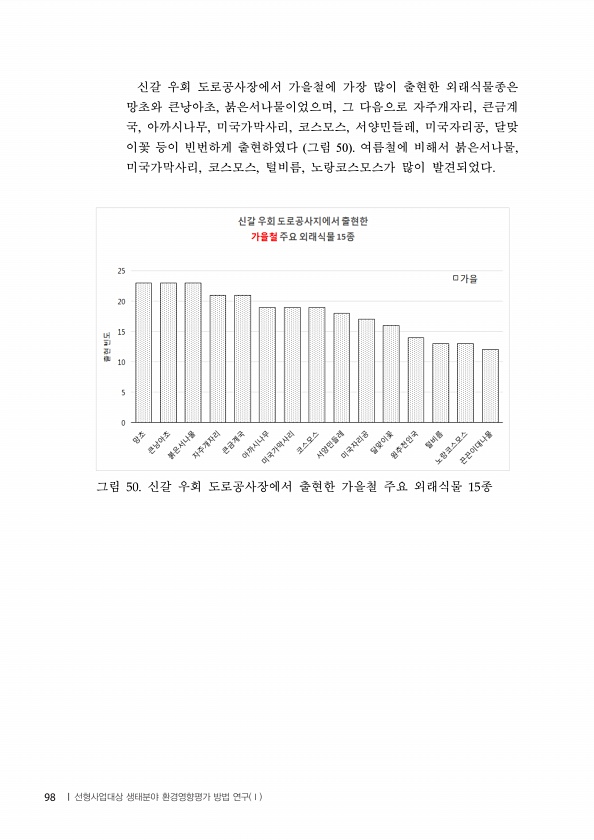 신갈 우회 도로공사장에서 가을철에 가장 많이 출현한 외래식물종은 망초와 큰낭아초, 붉은서나물이었으며, 그 다음으로 자주개자리, 큰금계 국, 아까시나무, 미국가막사리, 코스모스, 서양민들레, 미국자리공, 달맞 이꽃 등이 빈번하게 출현하였다 그림 50 여름철에 비해서 붉은서나물, 미국가막사리, 코스모스, 털비름, 노랑코스모스가 많이 발견되었다. 그림 신갈 우회 도로공사장에서 출현한 가을철 주요 외래식물 종 98 | 선형사업대상 생태분야 환경영향평가 방법 연구 Ⅰ