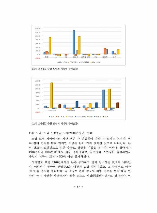 87 그림 2-2-12 수원 도엽의 지목별 증가율 1 그림 2-2-13 수원 도엽의 시기별 증가율 2 나 도엽도암 평창군 도암면 대관령면 일대 도암 도엽 지역에서의 지난 백년 간 변동폭이 가장 큰 토지는 논이다. 비 록 절대 면적은 많지 않지만 지금은 논이 거의 없어진 것으로 나타난다. 논 의 감소는 도암댐으로 인한 수몰도 영향을 미쳤을 것이다. 이밖에 취락지가 1910년대비 2016년에 35% 이상 증가하였고, 골프장과 스키장이 들어서면서 유원지 지목의 토지가 500% 이상 증가하였다. 시기별로 보면 1970년대까지 논은 증가하고 밭이 감소하는 것으로 나타난 다. 이때까지 한국의 산업구조는 여전히 농업 중심이었고, 그 중에서도 미작 米作 을 중시한 결과이다. 즉 소규모 관개 수로와 제방 축조를 통해 계곡 ...
