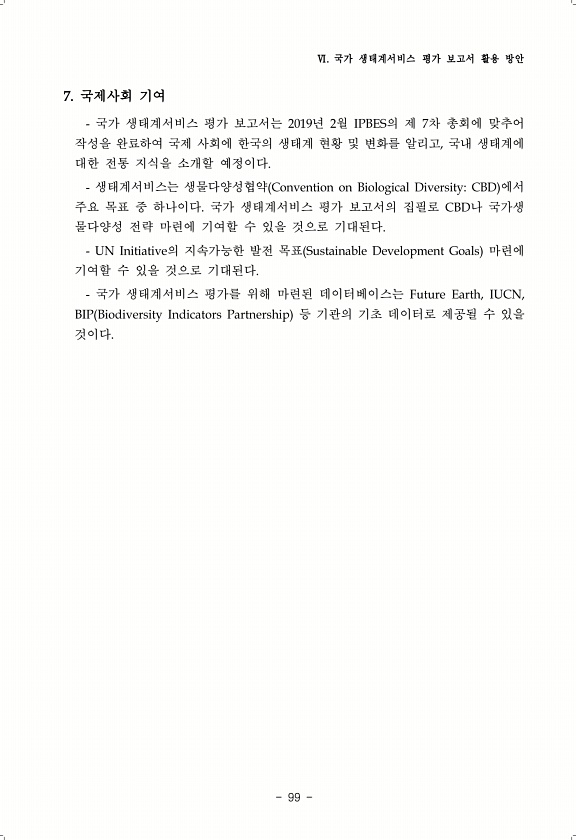 Ⅵ. 국가 생태계서비스 평가 보고서 활용 방안 99 7. 국제사회 기여 국가 생태계서비스 평가 보고서는 2019년 2월 IPBES의 제 7차 총회에 맞추어 작성을 완료하여 국제 사회에 한국의 생태계 현황 및 변화를 알리고, 국내 생태계에 대한 전통 지식을 소개할 예정이다. 생태계서비스는 생물다양성협약 Convention on Biological DiversityCBD 에서 주요 목표 중 하나이다. 국가 생태계서비스 평가 보고서의 집필로 CBD나 국가생 물다양성 전략 마련에 기여할 수 있을 것으로 기대된다. UN Initiative의 지속가능한 발전 목표 Sustainable Development Goals 마련에 기여할 수 있을 것으로 기대된다. 국가 생태계서비스 평가를 위해 마련된 데이터베이스는 Futur...