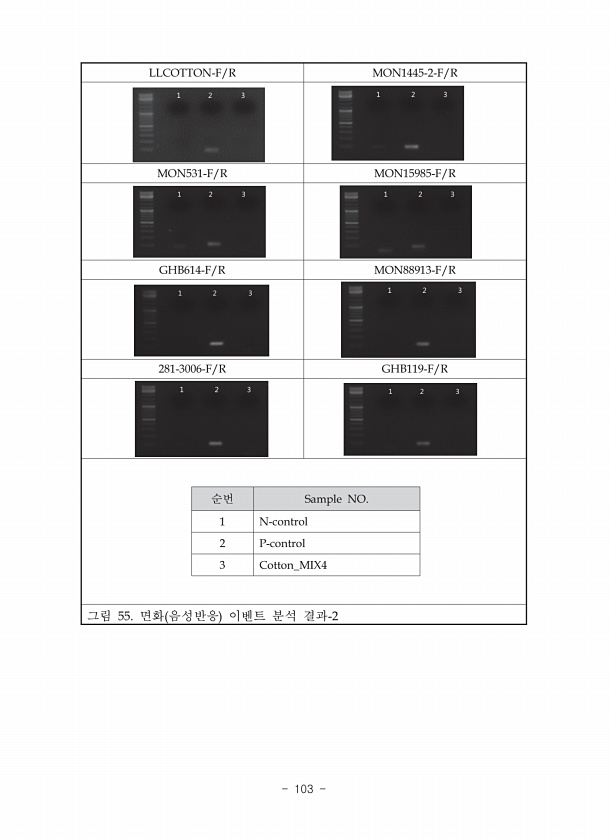 LLCOTTON-F/R MON1445-2-F/R MON531-F/R MON15985-F/R GHB614-F/R MON88913-F/R 281-3006-F/R GHB119-F/R 순번 Sample NO. 1 N-control 2 P-control 3 Cotton_MIX4 그림 55. 면화 음성반응 이벤트 분석결과-2