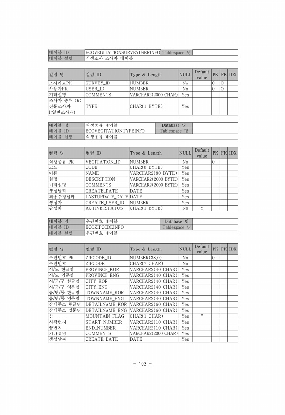 103 테이블 ID ECOVEGITATIONSURVEYUSERINFO Tablespace 명 테이블 설명 식생조사 조사자 테이블 컬럼 명 컬럼 ID Type & Length NULL Default value PK FK IDX 조사자료PK SURVEY_ID NUMBER No O O 사용자PK USER_ID NUMBER No O O 기타설명 COMMENTS VARCHAR2 2000 CHAR Yes 조사자 종류 R전문조사자, I일반조사자 TYPE CHAR 1 BYTE Yes 테이블 명 식생종류 테이블 Database 명 테이블 ID ECOVEGITATIONTYPEINFO Tablespace 명 테이블 설명 식생종류 테이블 컬럼 명 컬럼 ID Type & Length NULL Default value PK FK I...