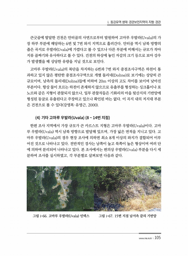 i. 동강유역 생태·경관보전지역의 지형·경관 www.nie.re.kr ?105 큰긋골에 발달한 건천은 안터골의 사면으로부터 발원하여 고마루 우발라 Uvala 의 가 장 하부 부분에 해당하는 6번 및 7번 와지 지역으로 흘러간다. 안터골 역시 남북 방향의 좁은 곡지로 우발라 Uvala 에 가깝다고 볼 수 있으나 다른 부분에 비해서는 규모가 작아 지류 골짜기와 유사하다고 볼 수 있다. 건천의 하상에 놓인 자갈의 크기 등으로 보아 강우 가 발생했을 때 상당한 유량을 지닐 것으로 보인다. 고마루 우발라 Uvala 의 북단을 차지하는 6번과 7번 와지 중점조사구역은 하천이 통 과하고 있지 않은 평탄한 중점조사구역으로 개별 돌리네 Doline 로 보기에는 상당히 큰 규모이며, 남측의 돌리네 Doline 들에 비하여 2...