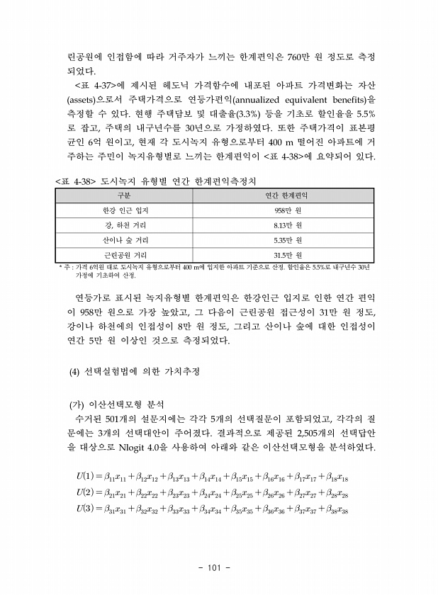 101 린공원에 인접함에 따라 거주자가 느끼는 한계편익은 만 원 정도로 측정 되었다 표 에 제시된 헤도닉 가격함수에 내포된 아파트 가격변화는 자산 으로서 주택가격으로 연등가편익 을 측정할 수 있다 현행 주택담보 및 대출율 등을 기초로 할인율을 로 잡고 주택의 내구년수를 년으로 가정하였다 또한 주택가격이 표본평 균인 억 원이고 현재 각 도시녹지 유형으로부터 떨어진 아파트에 거 주하는 주민이 녹지유형별로 느끼는 한계편익이 표 에 요약되어 있다 구분 연간 한계편익 한강 인근 입지 만 원 강 하천 거리 만 원 산이나 숲 거리 만 원 근린공원 거리 만 원 주 가격 억원 대로 도시녹지 유형으로부터 에 입지한 아파트 기준으로 산정 할인율은 로 내구년수 년 가정에 기초하여 산정 표 도시녹지 유형별 연간 한계편익측정치 연등...