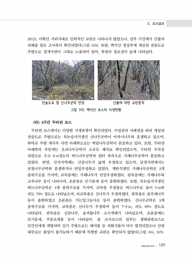 Ⅱ. 조사결과 www.nie.re.kr ? 109 2012 , 미확인 지뢰지대로 인위적인 교란은 나타나지 않았으나, 일부 구간에서 산불의 피해를 입은 고사목이 확인되었다 그림 103 또한, 백석산 정상부에 개설된 전술도로 주변으로 절개사면이 그대로 노출되어 있어, 복원의 필요성이 높게 나타났다. 전술도로 옆 신나무군락 전경 산불에 의한 교란흔적 그림 103. 백석산 코스의 식생현황 라 4구간 두타연 코스 두타연 코스에서는 다양한 식생유형이 확인되었다. 수입천과 사태천을 따라 개설된 전술도로 주변으로는 묵논습지식생인 신나무군락이 아까시나무와 혼생하고 있으며, 하야교 주변 계곡부 사면 아래쪽으로는 박달나무군락이 분포하고 있다. 또한, 두타연 아래쪽의 우안에는 오리나무군락이 소규모 패치로 확인되었으며, 두타연 주...