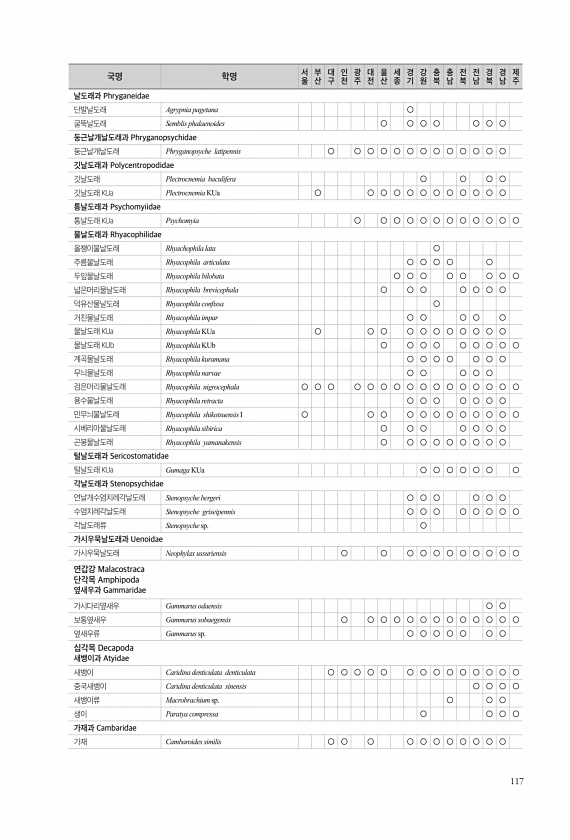 117 날도래과 Phryganeidae 단발날도래 Agrypnia pagetana ○ 굴뚝날도래 Semblis phalaenoides ○ ○ ○ ○ ○ ○ ○ 둥근날개날도래과 Phryganopsychidae 둥근날개날도래 Phryganopsyche latipennis ○ ○ ○ ○ ○ ○ ○ ○ ○ ○ ○ ○ ○ 깃날도래과 Polycentropodidae 깃날도래 Plectrocnemia baculifera ○ ○ ○ ○ 깃날도래 KUa Plectrocnemia KUa ○ ○ ○ ○ ○ ○ ○ ○ ○ ○ ○ ○ 통날도래과 Psychomyiidae 통날도래 KUa Psychomyia ○ ○ ○ ○ ○ ○ ○ ○ ○ ○ ○ ○ 물날도래과 Rhyacophilidae 올챙이물날도래 Rhyachophila lata ...