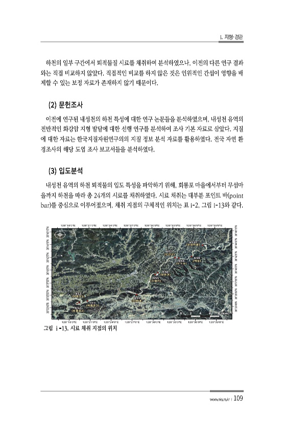 i. 지형·경관 www.nie.re.kr ?109 하천의 일부 구간에서 퇴적물질 시료를 채취하여 분석하였으나, 이전의 다른 연구 결과 와는 직접 비교하지 않았다. 직접적인 비교를 하지 않은 것은 인위적인 간섭이 영향을 배 제할 수 있는 보정 자료가 존재하지 않기 때문이다. 2 이전에 연구된 내성천의 하천 특성에 대한 연구 논문들을 분석하였으며, 내성천 유역의 전반적인 화강암 지형 발달에 대한 선행 연구를 분석하여 조사 기본 자료로 삼았다. 지질 에 대한 자료는 한국지질자원연구의의 지질 정보 분석 자료를 활용하였다. 전국 자연 환 경조사의 해당 도엽 조사 보고서들을 분석하였다. 3 내성천 유역의 하천 퇴적물의 입도 특성을 파악하기 위해, 회룡포 마을에서부터 무섬마 을까지 하천을 따라 총 24개의 시료를 채취하...