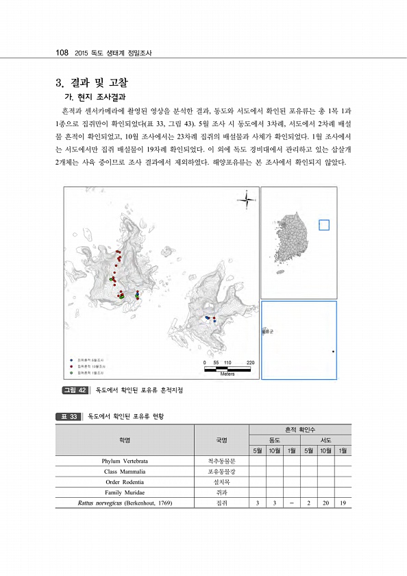 108 2015 독도 생태계 정밀조사 3. 결과 및 고찰 가. 현지 조사결과 흔적과 센서카메라에 촬영된 영상을 분석한 결과, 동도와 서도에서 확인된 포유류는 총 1목 1과 1종으로 집쥐만이 확인되었다 표 33, 그림 43 5월 조사 시 동도에서 3차례, 서도에서 2차례 배설 물 흔적이 확인되었고, 10월 조사에서는 23차례 집쥐의 배설물과 사체가 확인되었다. 1월 조사에서 는 서도에서만 집쥐 배설물이 19차례 확인되었다. 이 외에 독도 경비대에서 관리하고 있는 삽살개 2개체는 사육 중이므로 조사 결과에서 제외하였다. 해양포유류는 본 조사에서 확인되지 않았다. 그림 42 독도에서 확인된 포유류 흔적지점 학명 국명 흔적 확인수 동도 서도 5월 10월 1월 5월 10월 1월 Phylum Vertebrata 척추동...