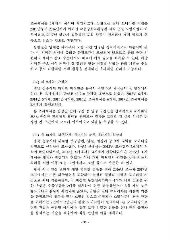 95 조사에서는 3개체의 서식이 확인되었다. 삼랑진읍 일대 모니터링 지점은 2015년부터 2016년까지 이어진 낙동강유역환경청 서식 근절 시범사업이 이 루어졌고, 2017년 상반기 집중적인 포획 활동이 전개되어 개체 밀도가 큰 폭으로 감소한 것으로 판단된다. 삼랑진읍 일대는 과거부터 오랜 기간 안정된 정착지역으로 이용되어 왔 다. 이 지역은 서식에 유리한 환경조건이 조성되어 있으므로 관리 중단 시 현재의 개체수 감소 수준에서도 빠르게 개체 규모를 회복할 수 있다. 해당 지역은 주요 서식 거점이 잘 알려진 만큼 거점별 적합한 관리 계획을 수립 하고 동시 다발적인 포획 활동을 전개하면 효과적인 관리가 가능하다. 자 제 9지역반성천 경남 진주시에 위치한 반성천은 유속이 완만하고 퇴적층이 잘 형성되어 있다. 본 조...