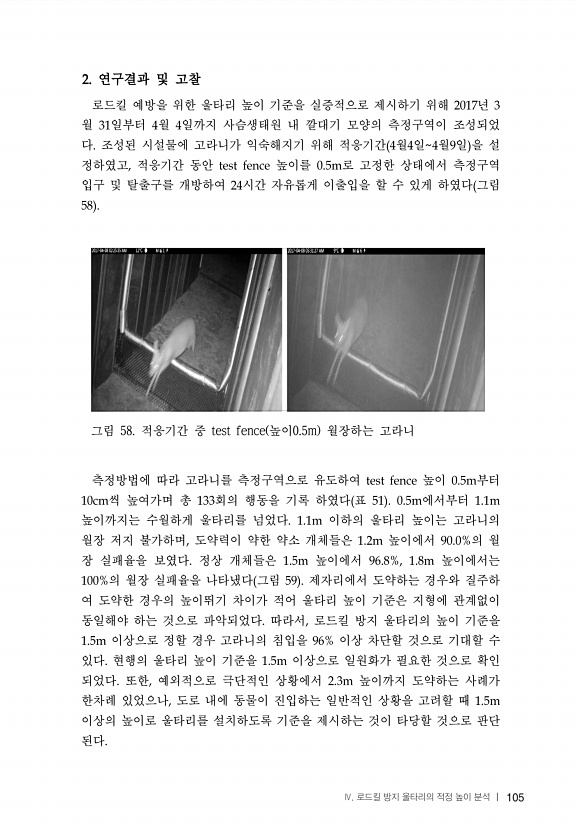 105 연구결과 및 고찰 로드킬 예방을 위한 울타리 높이 기준을 실증적으로 제시하기 위해 년 월 일부터 월 일까지 사슴생태원 내 깔대기 모양의 측정구역이 조성되었 다 조성된 시설물에 고라니가 익숙해지기 위해 적응기간 월 일 월 일 을 설 정하였고 적응기간 동안 높이를 로 고정한 상태에서 측정구역 입구 및 탈출구를 개방하여 시간 자유롭게 이출입을 할 수 있게 하였다 그림 그림 58. 적응기간 중 test fence 높이0.5m 월장하는 고라니 측정방법에 따라 고라니를 측정구역으로 유도하여 높이 부터 씩 높여가며 총 회의 행동을 기록 하였다 표 에서부터 높이까지는 수월하게 울타리를 넘었다 이하의 울타리 높이는 고라니의 월장 저지 불가하며 도약력이 약한 약소 개체들은 높이에서 의 월 장 실패율을 보였다 정상 개체...