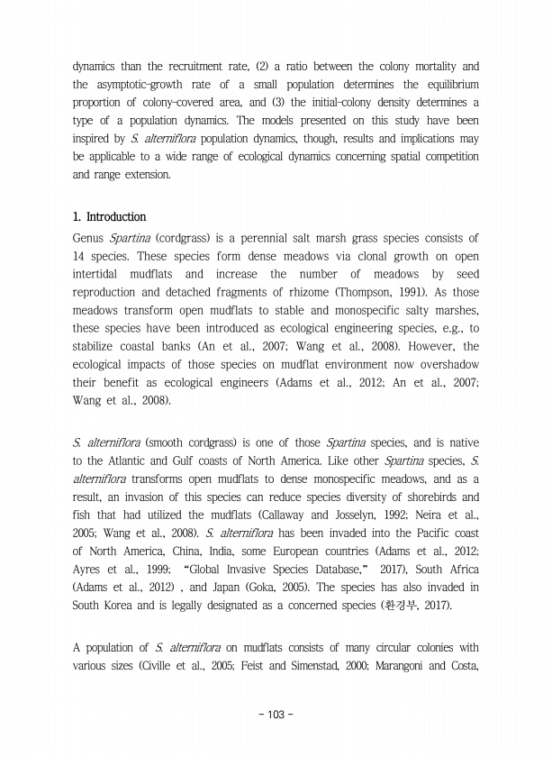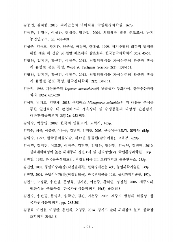 93 김동언, 길지현. 2013. 외래곤충과 먹이식물. 국립환경과학원. 167p. 김동환, 김광식, 이성찬, 현재욱, 임한철. 2004. 외래해충 발생 분포조사. 난지 농업연구소. pp. 402-408 김성문, 김용호, 황기환, 안문섭, 허장현, 한대성. 1999. 애기수영의 화학적 방제를 위한 제초 제 선발 및 선발 제초제의 살초효과. 한국농약과학회지 3 3 45-53. 김영하, 길지현, 황선민, 이창우. 2013. 침입외래식물 가시상추의 확산과 생육 지 유형별 분포 특성. Weed & Turfgrass Science 2 2 138-151. 김영하, 길지현, 황선민, 이창우. 2013. 침입외래식물 가시상추의 확산과 생육 지 유형별 분포 특성. 한국잔디학회. 2 2 138-151. 김용억. 1986. 파랑...
