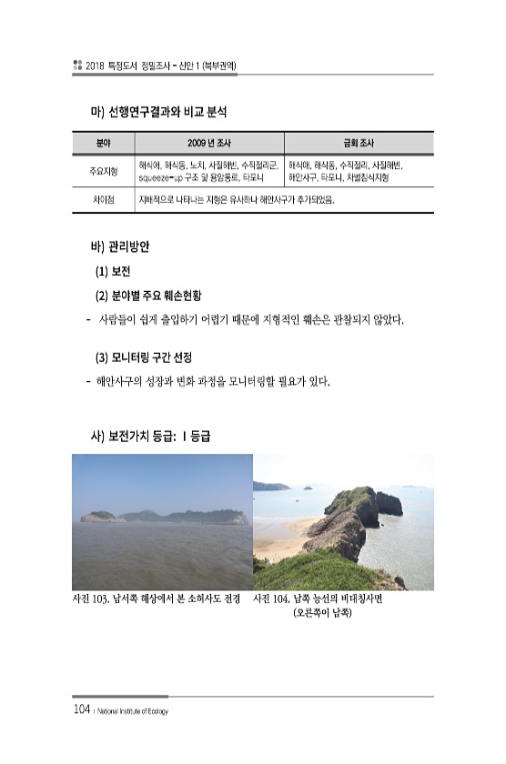 2018 특정도서 정밀조사 신안 1 북부권역 104 ? National Institute of Ecology 분야 2009 년 조사 금회 조사 주요지형 해식애, 해식동, 노치, 사질해빈, 수직절리군, squeeze-up 구조 및 용암통로, 타포니 해식애, 해식동, 수직절리, 사질해빈, 해안사구, 타포니, 차별침식지형 차이점 지배적으로 나타나는 지형은 유사하나 해안사구가 추가되었음. 1 2 사람들이 쉽게 출입하기 어렵기 때문에 지형적인 훼손은 관찰되지 않았다. 3 해안사구의 성장과 변화 과정을 모니터링할 필요가 있다. 사진 103. 남서쪽 해상에서 본 소허사도 전경 사진 104. 남쪽 능선의 비대칭사면 오른쪽이 남쪽