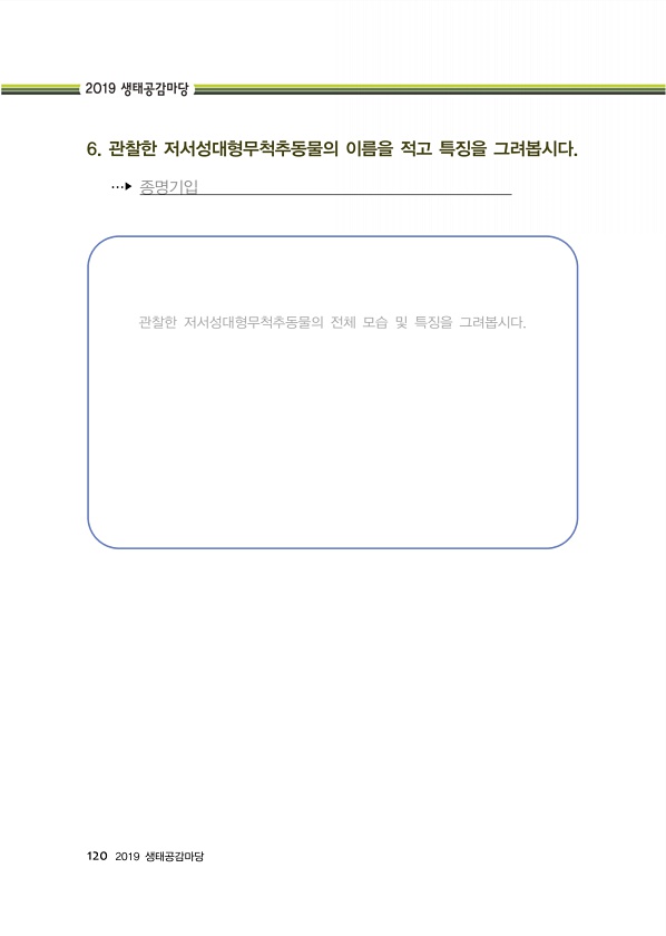120 2019 생태공감마당 6. 관찰한 저서성대형무척추동물의 이름을 적고 특징을 그려봅시다. …? 종명기입 관찰한 저서성대형무척추동물의 전체 모습 및 특징을그려봅시다.