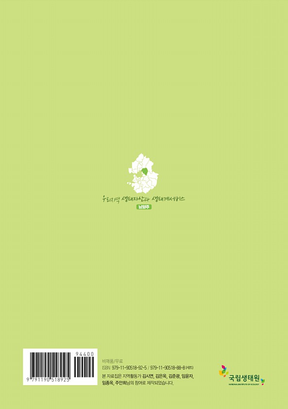 남양주 우리지역생태자산과 생태계서비스 비매품/무료 ISBN 979-11-90518-92-5 979-11-90518-88-8 세트 본 자료집은 지역활동가 김시연, 김은옥, 김준광, 임윤자, 임종옥, 주안희님의 참여로제작되었습니다.