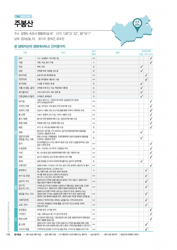 No. 속초- 본 생태자산의 생태계서비스 간이평가지 구분 예시 평가 등급 설명 규모별 혜택 지점 지역 국가 공급 담수 식수, 농업용수, 축산 용수 등 ++ √ 식량 곡물, 과실, 물고기 등 + √ 연료 화목, 토탄 0 √ 섬유 건축용 목재, 의류용 섬유 등 0 √ 유전자원 농업·축산업 희귀품종 등 ++ √ 천연약재 전통 의약품에 사용되는 식물 ++ √ 장식재료 수집용 조개껍질, 꽃 등 0 √ 진흙,미네랄, 골재 건축용 모래 또는 자갈, 벽돌재료 진흙 등 0 √ 폐기물처리 고체 쓰레기 하치, 폐수 방류 등 0 √ 친환경에너지발전 조력발전, 풍력발전 0 √ 조절 대기질 자동차 배기가스, 산업체 대기오염, 농업발생 먼지 등의 대기 미세물질의 제거 ++ √ 지역적 기후 그늘, 대기온도 저하 등의 지역 미세기후 조절...