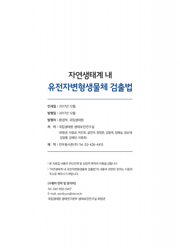 인쇄일Ⅰ2017년 12월 발행일Ⅰ2017년 12월 발행처Ⅰ환경부, 국립생태원 저 자Ⅰ국립생태원 생태보전연구실 최원균, 이중로, 박진호, 설민아, 정영준, 김동욱, 임혜송, 엄순재, 김일룡, 김혜빈, 이중효 제 작Ⅰ전우용사촌 주 Tel. 02-426-4415 자연생태계 내 유전자변형생물체 검출법 ?본 자료집 내용의 무단전재 및 상업적 목적의 이용을 금합니다 ?“자연생태계 내 유전자변형생물체 검출법”의 내용과 관련된 문의는 다음의 주소로 해주시기 바랍니다. [수행자 연락 및 문의처] Tel. 041-950-5417 E-mail. wonkyun@nie.re.kr 국립생태원 생태연구본부 생태보전연구실최원균