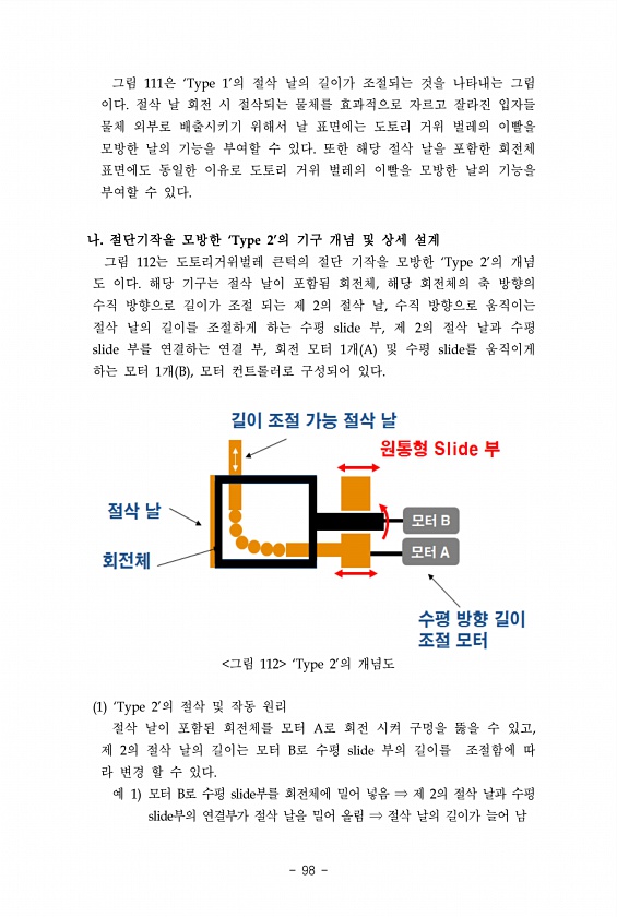 98 그림 111은 ‘Type 1’의 절삭 날의 길이가 조절되는 것을 나타내는 그림 이다. 절삭 날 회전 시 절삭되는 물체를 효과적으로 자르고 잘라진 입자들 물체 외부로 배출시키기 위해서 날 표면에는 도토리 거위 벌레의 이빨을 모방한 날의 기능을 부여할 수 있다. 또한 해당 절삭 날을 포함한 회전체 표면에도 동일한 이유로 도토리 거위 벌레의 이빨을 모방한 날의 기능을 부여할 수 있다. 나. 절단기작을 모방한 ‘Type 2’의 기구 개념 및 상세 설계 그림 112는 도토리거위벌레 큰턱의 절단 기작을 모방한 ‘Type 2’의 개념 도 이다. 해당 기구는 절삭 날이 포함됨 회전체, 해당 회전체의 축 방향의 수직 방향으로 길이가 조절 되는 제 2의 절삭 날, 수직 방향으로 움직이는 절삭 날의 길이를 조절하게 하는 ...
