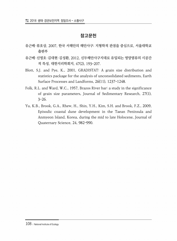 2018 생태·경관보전지역 정밀조사 소황사구 108 ? National Institute of Ecology 유근배·류호상, 2007, 한국 서해안의 해안사구지형학적 관점을 중심으로, 서울대학교 출판부 유근배·신영호·김대현·김성환, 2012, 신두해안사구지대로 유입되는 영양염류의 시공간 적 특성, 대한지리학회지, 47 2 , 193-207. Blott, S.J. and Pye, K., 2001, GRADISTATA grain size distribution and statistics package for the analysis of unconsolidated sediments, Earth Surface Processes and Landforms, 26 11 , 1237-1248. Folk, R.L. and ...