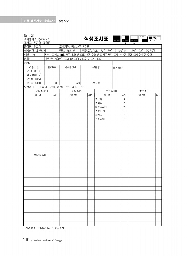 전국 해안사구 정밀조사 맹방사구 110 ? National Institute of Ecology No 21 조사일자 15.06.27. 조사자전지영, 조영준 식생조사표 군락명갯그령 조사지역맹방사구 3구간 식생상관초본식생 면적2x2 ㎡ 위?경도 GPS 37° 39′ 41.75″N, 129° 22′ 49.89E 해발m 지형□해빈 ■전사구 전면부 □전사구 후면부 □사구저지 □배후사구 전면 □배후사구 후면 방위낙엽부식층 cm □≥20 □ 15 □ 10 □ 5 □0 경사계층구분 높이 m 식피율 % 우점종 특기사항교 목 층 T1 아교목층 T2 관 목 층 S 초 본 층 H 0.3 40 갯그령 우점종 DBH 최대 cm , 중간 cm , 최소 cm 교목층 T1 관목층 S 초본층 H 초본층 H 종 명 피도 종 명 피도 종 명 ...