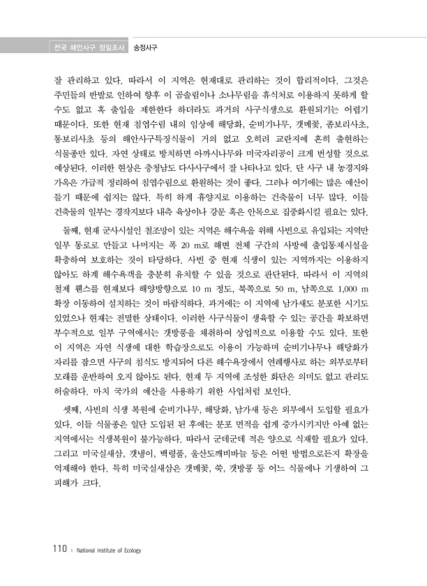 전국 해안사구 정밀조사 송정사구 110 ? National Institute of Ecology 잘 관리하고 있다. 따라서 이 지역은 현재대로 관리하는 것이 합리적이다. 그것은 주민들의 반발로 인하여 향후 이 곰솔림이나 소나무림을 휴식처로 이용하지 못하게 할 수도 없고 혹 출입을 제한한다 하더라도 과거의 사구식생으로 환원되기는 어렵기 때문이다. 또한 현재 침엽수림 내의 임상에 해당화, 순비기나무, 갯메꽃, 좀보리사초, 통보리사초 등의 해안사구특징식물이 거의 없고 오히려 교란지에 흔히 출현하는 식물종만 있다. 자연 상태로 방치하면 아까시나무와 미국자리공이 크게 번성할 것으로 예상된다. 이러한 현상은 충청남도 다사사구에서 잘 나타나고 있다. 단 사구 내 농경지와 가옥은 가급적 정리하여 침엽수림으로 환원하는 것이...