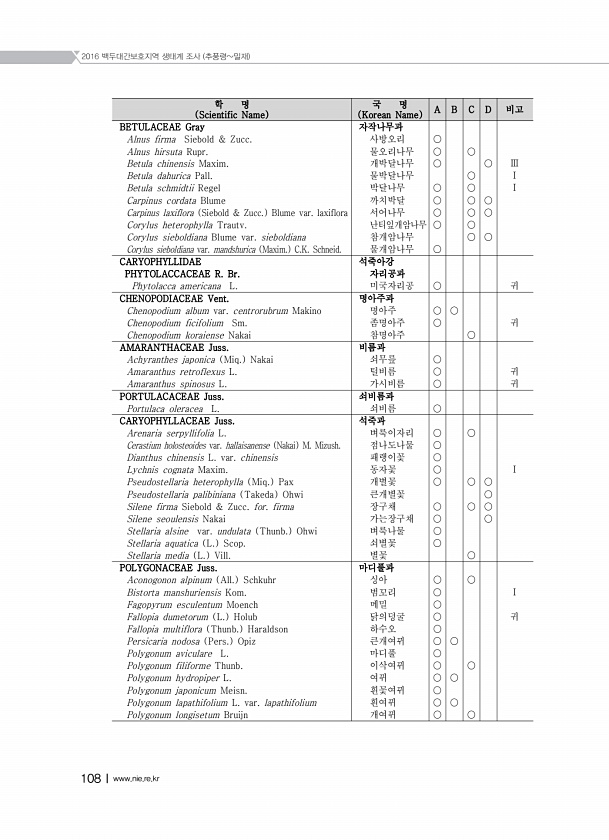 2016 백두대간보호지역 생태계 조사 추풍령밀재 108Ⅰwww.nie.re.kr 학 명 Scientific Name 국 명 Korean Name A B C D 비고 BETULACEAE Gray 자작나무과 Alnus firma Siebold & Zucc. 사방오리 ○ Alnus hirsuta Rupr. 물오리나무 ○ ○ Betula chinensis Maxim. 개박달나무 ○ ○ Ⅲ Betula dahurica Pall. 물박달나무 ○ Ⅰ Betula schmidtii Regel 박달나무 ○ ○ Ⅰ Carpinus cordata Blume 까치박달 ○ ○ ○ Carpinus laxiflora Siebold & Zucc. Blume var. laxiflora 서어나무 ○ ○ ○ Corylus heterophyl...