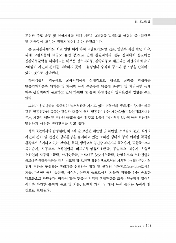 Ⅱ. 조사결과 www.nie.re.kr ? 109 훈련과 주로 율무 및 인삼재배를 위해 기존의 2차림을 벌채하고 삼림의 중·하단부 및 계곡부에 조성한 경작지 밭 에 의한 파편화이다. 본 조사결과에서도 이로 인한 여러 가지 교란요인 토양 건조, 임연부 식생 발달 미약, 외래 교란식물의 대규모 유입 등 으로 인해 철원지역의 일부 산지대에 분포하는 신갈나무군락을 제외하고는 대부분 상수리나무, 갈참나무로 대표되는 저산지대의 초기 2차림이 자연적 천이를 지속하지 못하고 유령림의 수직적 구조와 종조성을 반복하고 있는 것으로 판단된다. 하천식생의 경우에도 군사지역에서 상대적으로 대규모 군락을 형성하는 단풍잎돼지풀과 돼지풀 및 가시박 등이 수충부를 비롯해 홍수터 및 제방사면 등에 매우 광범위하게 분포하고 있어 하천변 및 ...
