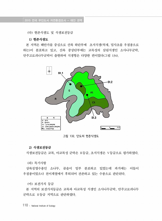 2015 전국 무인도서 자연환경조사 태안 권역 110 ? National Institute of Ecology 다 현존식생도 및 식생보전등급 1 현존식생도 본 지역은 해안가를 중심으로 산록 하단부에 초지식생 억새, 밀사초를 우점종으로 하는 이 분포하고 있고, 산록 중상단부에는 교목성의 삼림식생인 소사나무군락, 만주고로쇠나무군락이 출현하여 식생형은 다양한 편이었다 그림 134 그림 132. 단도의 현존식생도 2 식생보전등급 식생보전등급은 교목, 아교목성 군락은 Ⅱ등급, 초지식생은 Ⅴ등급으로 평가하였다. 라 특기사항 상록침엽수종인 소나무, 곰솔이 일부 분포하고 있었는데 과거에는 이들이 우점종이었으나 천이계열에서 후퇴되어 잔존하고 있는 수종으로 판단된다. 마 보전가치 등급 본 지역의 보전가치등급은 교목과 아교목성...