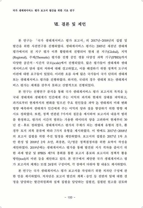 국가 생태계서비스 평가 보고서 발간을 위한 기초 연구 100 Ⅶ. 결론 및 제언 본 연구는 「국가 생태계서비스 평가 보고서」의 2017년2018년의 집필 및 발간을 위한 사전연구를 진행하였다. 생태계서비스 평가는 2005년 새천년 생태계 평가에서의 전 지구 평가 이후 활발하게 진행되어 현재 전 지구 Global , 지역 Regional , 주제 Thematic 평가를 진행 중인 생물 다양성 과학 기구 IPBES 까지 다양한 공간적?시간적 규모 scale 에서 진행되었다. 많은 평가들이 생태계와 생태 계서비스의 양과 질의 저하에 대해 경고하였고, 이를 해결하기 위한 정책적 도구의 마련에 대한 요구들이 있었다. 이러한 흐름 속에 많은 국가들이 국가 단위의 생태계 또는 생태계서비스 평가를 진행하였다. 하지만, 국...