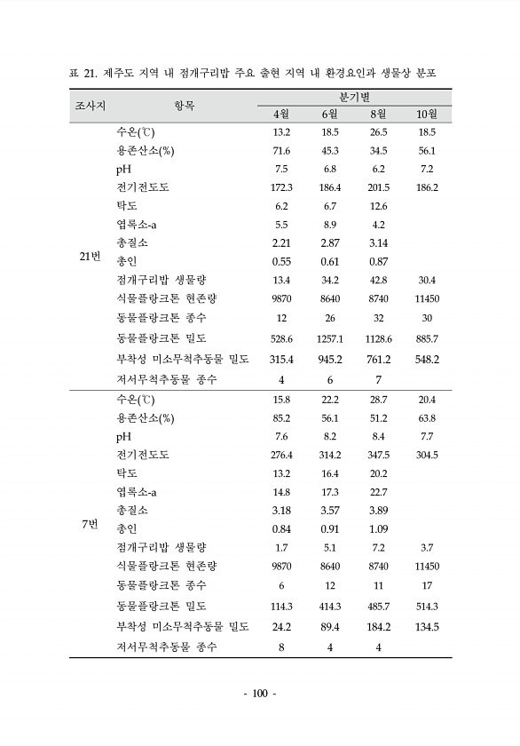 100 표 21. 제주도 지역 내 점개구리밥 주요 출현 지역 내 환경요인과 생물상 분포 조사지 항목 분기별 4월 6월 8월 10월 21번 수온 ℃ 13.2 18.5 26.5 18.5 용존산소 % 71.6 45.3 34.5 56.1 pH 7.5 6.8 6.2 7.2 전기전도도 172.3 186.4 201.5 186.2 탁도 6.2 6.7 12.6 엽록소-a 5.5 8.9 4.2 총질소 2.21 2.87 3.14 총인 0.55 0.61 0.87 점개구리밥 생물량 13.4 34.2 42.8 30.4 식물플랑크톤 현존량 9870 8640 8740 11450 동물플랑크톤 종수 12 26 32 30 동물플랑크톤 밀도 528.6 1257.1 1128.6 885.7 부착성 미소무척추동물 밀도 315.4 945.2 761....
