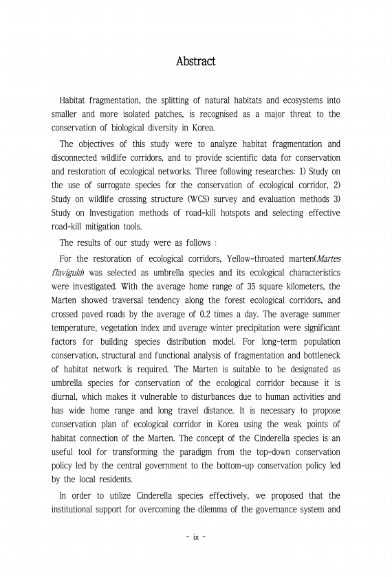 ix Abstract Habitat fragmentation, the splitting of natural habitats and ecosystems into smaller and more isolated patches, is recognised as a major threat to the conservation of biological diversity in Korea. The objectives of this study were to analyze habitat fragmentation and disconnected wildlife corridors, and to provide scientific data for conservation and restoration of ecological networks...