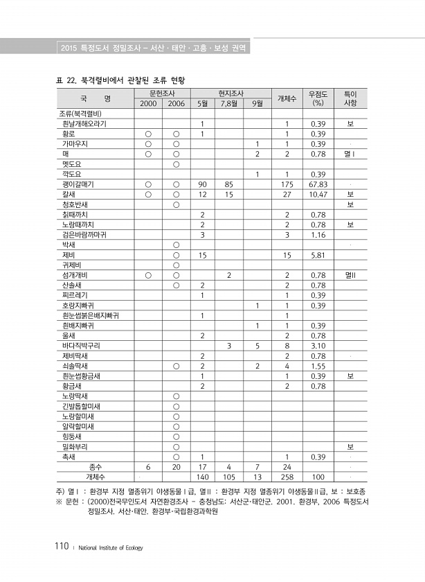 2015 특정도서 정밀조사 서산·태안·고흥·보성 권역 110 ? National Institute of Ecology 표 22. 북격렬비에서 관찰된 조류 현황 국 명 문헌조사 현지조사 개체수 우점도 % 특이 2000 2006 5월 7,8월 9월 사항 조류 북격렬비 흰날개해오라기 1 1 0.39 보 황로 ○ ○ 1 1 0.39 가마우지 ○ ○ 1 1 0.39 매 ○ ○ 2 2 0.78 멸Ⅰ 멧도요 ○ 꺅도요 1 1 0.39 괭이갈매기 ○ ○ 90 85 175 67.83 칼새 ○ ○ 12 15 27 10.47 보 청호반새 ○ 보 칡때까치 2 2 0.78 노랑때까치 2 2 0.78 보 검은바람까마귀 3 3 1.16 박새 ○ 제비 ○ 15 15 5.81 귀제비 ○ 섬개개비 ○ ○ 2 2 0.78 멸II ...