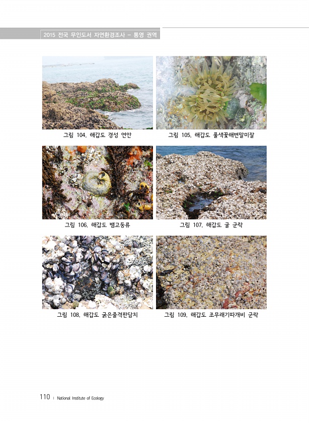2015 전국 무인도서 자연환경조사 통영 권역 110 ? National Institute of Ecology 그림 104. 해갑도 경성 연안 그림 105. 해갑도 풀색꽃해변말미잘 그림 106. 해갑도 뱀고둥류 그림 107. 해갑도 굴 군락 그림 108. 해갑도 굵은줄격판담치 그림 109. 해갑도 조무래기따개비군락
