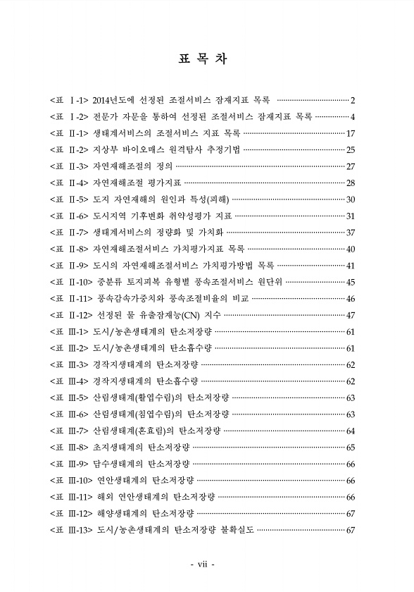 표 목 차 표 년도에 선정된 조절서비스 잠재지표 목록 표 전문가 자문을 통하여 선정된 조절서비스 잠재지표 목록 표 생태계서비스의 조절서비스 지표 목록 표 지상부 바이오매스 원격탐사 추정기법 표 자연재해조절의 정의 표 자연재해조절 평가지표 표 도지 자연재해의 원인과 특성 피해 표 도시지역 기후변화 취약성평가 지표 표 생태계서비스의 정량화 및 가치화 표 자연재해조절서비스 가치평가지표 목록 표 도시의 자연재해조절서비스 가치평가방법 목록 표 중분류 토지피복 유형별 풍속조절서비스 원단위 표 풍속감속가중치와 풍속조절비율의 비교 표 선정된 물 유출잠재능 지수 표 도시 농촌생태계의 탄소저장량 표 도시 농촌생태계의 탄소흡수량 표 경작지생태계의 탄소저장량 표 경작지생태계의 탄소흡수량 표 산림생태계 활엽수림 의 탄소저장량 표 ...