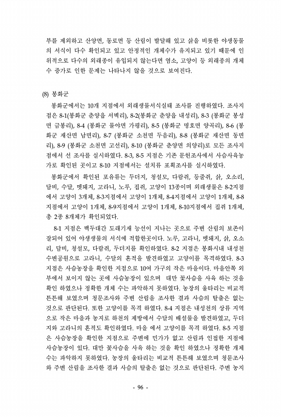 부를 제외하고 산양면, 동로면 등 산림이 발달해 있고 삵을 비롯한 야생동물 의 서식이 다수 확인되고 있고 안정적인 개체수가 유지되고 있기 때문에 인 위적으로 다수의 외래종이 유입되지 않는다면 염소, 고양이 등 외래종의 개체 수 증가로 인한 문제는 나타나지 않을 것으로 보여진다. 8 봉화군 봉화군에서는 10개 지점에서 외래생물서식실태 조사를 진행하였다. 조사지 점은 8-1 봉화군 춘양읍 서벽리 , 8-2 봉화군 춘양읍 내성리 , 8-3 봉화군 봉성 면 금봉리 , 8-4 봉화군 물야면 가평리 , 8-5 봉화군 명호면 양곡리 , 8-6 봉 화군 재산면 남면리 , 8-7 봉화군 소천면 두음리 , 8-8 봉화군 재산면 동면 리 , 8-9 봉화군 소천면 고선리 , 8-10 봉화군 춘양면 의양리 로 모든 조사지 점에서 ...
