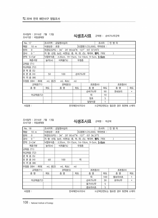2016 전국 해안사구 정밀조사 108 ? National Institute of Ecology 조사일자 2016년 7월 13일 조사기관 국립생태원 식생조사표 군락명 순비기나무군락 No. 17 조사지역 금일명사십리 조사자 민 병 미 해발10 m 식생상관 초원 도엽명 1/25,000 , 격자번호 방위0 위경도 GPS 34° 2000.64N 127° 0337.05E 경사0 ° 지 형산정, 능선, 사면 상, 중, 하, 凹, 凸 , 계곡부, 평지, 기타 면적5×5㎡ 낙엽부식층 ≥20cm, 19-15cm, 14-10cm, 9-5cm, 5-0cm 계층구분 높이 m 식피율 % 우점종 교목층 T1 아교목층 T2 관 목 층 S 초 본 층 H 50 100 순비기나무 이 끼 층 M 우점종 DBH 최대 m , 중간 m , 최소 ...