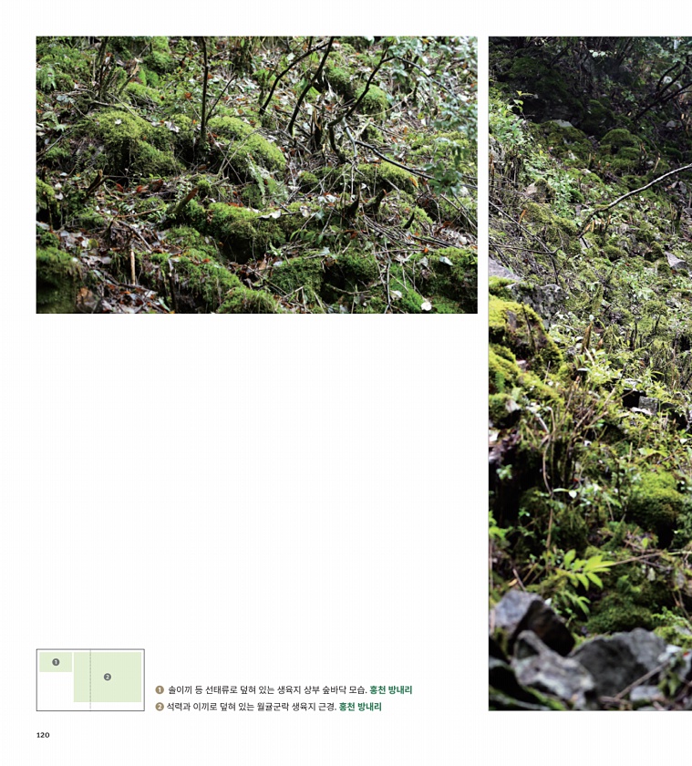 ? ? ? 솔이끼 등 선태류로 덮혀 있는 생육지 상부 숲바닥 모습. 홍천 방내리 ? 석력과 이끼로 덮혀 있는 월귤군락 생육지 근경. 홍천 방내리120