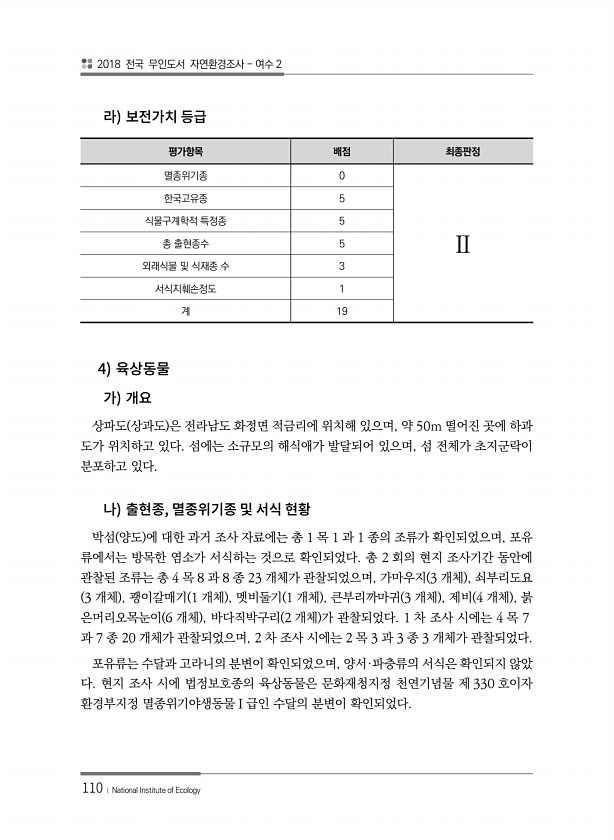 2018 전국 무인도서 자연환경조사 여수 2 110 ? National Institute of Ecology 평가항목 배점 최종판정 멸종위기종 0 Ⅱ 한국고유종 5 식물구계학적 특정종 5 총 출현종수 5 외래식물 및 식재종 수 3 서식지훼손정도 1 계 19 4 상파도 상과도 은 전라남도 화정면 적금리에 위치해 있으며, 약 50m 떨어진 곳에 하과 도가 위치하고 있다. 섬에는 소규모의 해식애가 발달되어 있으며, 섬 전체가 초지군락이 분포하고 있다. , 박섬 양도 에 대한 과거 조사 자료에는 총 1 목 1 과 1 종의 조류가 확인되었으며, 포유 류에서는 방목한 염소가 서식하는 것으로 확인되었다. 총 2 회의 현지 조사기간 동안에 관찰된 조류는 총 4 목 8 과 8 종 23 개체가 관찰되었으며, 가마우지 3 개체...