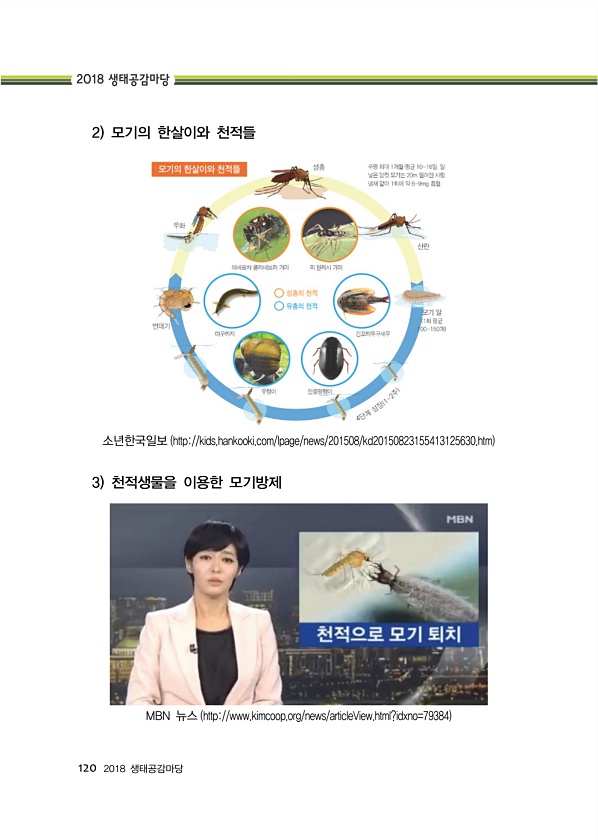 120 2018 생태공감마당 2 모기의 한살이와 천적들 소년한국일보 http//kids.hankooki.com/lpage/news/201508/kd20150823155413125630.htm 3 천적생물을 이용한 모기방제 MBN 뉴스 http//www.kimcoop.org/news/articleView.html?idxno=79384
