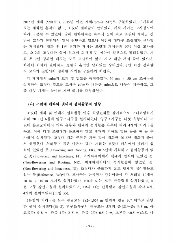 93 2015 ‘2015F’ , 2015 ‘pre-2015F’ , 1 90% , 2 , 2 culm 50 cm 50 cm culm culm , 2017 6 4 , 2015 Flowering and Rooting, FR , 2015 Flowering and Intactness, FI , Non-flowering and Rooting, NR , Non-flowering and Intactness, NI , Reference, Ref 10 10 m 10 m NR NI , R , FR FI 6 , 4 55 5 8821,054 m 30° 8 5 8 m, 58 m, 1 25 m, 2 0.52 m, 0.5 m