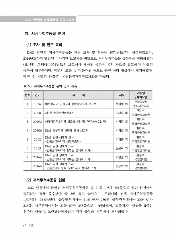 DMZ 일원의 생물다양성 종합보고서 94 차. 저서무척추동물 분야 1 조사 및 연구 목록 DMZ 일원의 저서무척추동물 관련 조사 및 연구는 1974년도부터 시작되었으며, 2014년도까지 발간된 국가기관 보고서를 바탕으로 저서무척추동물 종목록을 정리하였다 표 55 그러나 1974년도의 보고서에 제시된 목록은 국외 자료를 참고하여 작성된 목록이 대부분이며, 학명의 오류 및 미분류된 종으로 문헌 정리 대상에서 제외하였다. 학명 및 국명은 환경부·국립환경과학원 2012 을 따랐다. 번호 연도 제 목 저자 기관명 /학회지명 1 1974 비무장지대 인접지역 종합학술조사 보고서 윤일병 외 문화공보부 문화재관리국 2 2008 제3차 전국자연환경조사 박재흥 외 환경부· 국립환경과학원 3 2010a 생태경관우수지역 발굴조사 ...