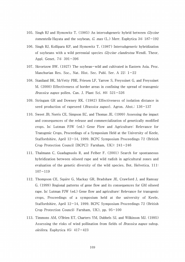 109 105. Singh RJ and Hymowitz T. 1985 An intersubgeneric hybrid between Glycine tomentella Hayata and the soybean, G. max L. Merr. Euphytica 34187-192 106. Singh RJ, Kollipara KP, and Hymowitz T. 1987 Intersubgeneric hybridization of soybeans with a wild perennial species Glycine clandestna Wendl. Theor, Appl. Genet. 74391-396 107. Skvortzow BW. 1927 The soybean-wild and cultivated in Eastern Asi...